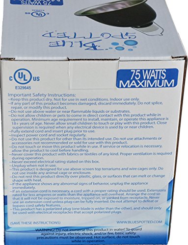 75 watt maximum lamp / bulb size. Designed for use with Blue Spotted Ceramic Heat Emitters, 10.0 UVB, Sunning lamps, Infrared & Day lights