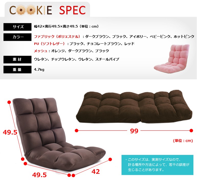| 特長 | ■5段階の角度調節 ■楽々座れる余裕のある作り ■ボリューム感あるもこもこクッション |