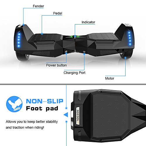 4. RGB LED Lights 5. Battery Indicators 6. 2x 250W brushless motors 7. 6.5-inch Non-pneumatic tires 8. NON-SLIP Rubber bumpers Electric Self-Balancing Scooter, Hoverboard Specification: Housing:
