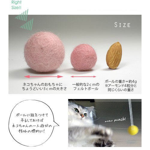 The size is 3 cm in diameter and it exquisitely tickles the curiosity of cats exquisitely.