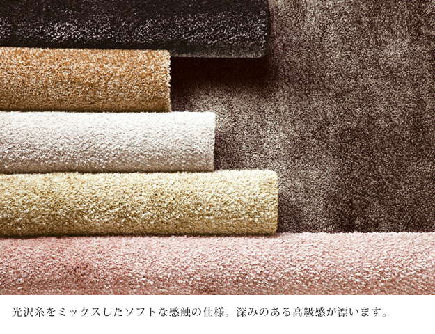 ●商品について:ウイルトン織りの高品質シャギーラグ。毛足21mmのボリューム感と柔らかな肌触り。光沢糸がミックスされてゴージャスな雰囲気を醸し出しています。