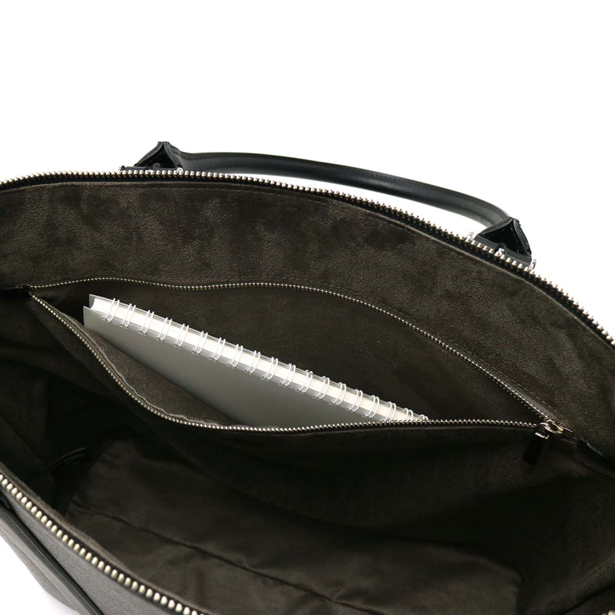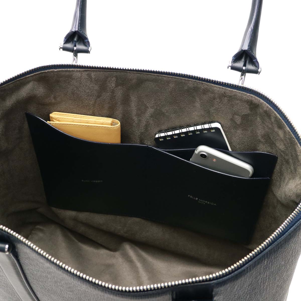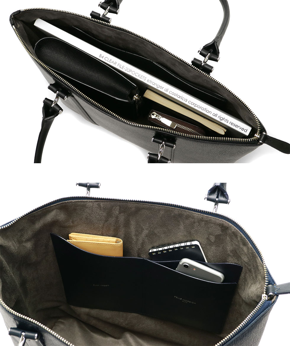 Main room where B4 size correspondence, plenty of documents are contained. Because there is a depth while looking slim, you can store the necessary items roughly. The cut line of the inner pocket is a message that imaged the waves and the message of "Buon viaggio / good trip!" Is engraved.