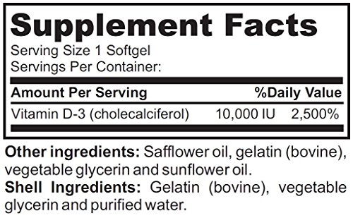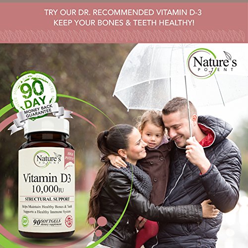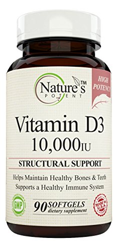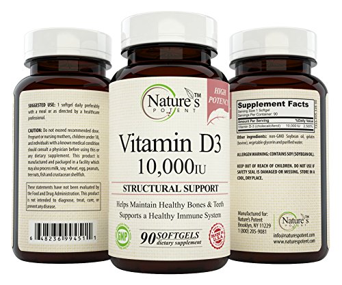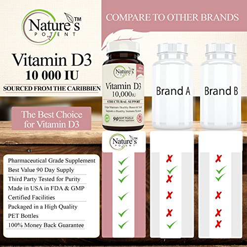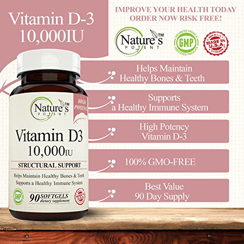 -. Feature : Supports a Healthy Immune System / Helps Maintain Healthy Bones & Teeth / Non-GMO High Potency Vitamin D-3 10,000 iu / Pharmaceutical Grade - Nature's Potent Vitamin D-3 10,000 Iu - Made to Nature's Potent guaranteed purity potency standards / 100% Safe - All our products Made in USA in FDA & GMP Certified Facilities - Third Party Tested to insure 100% Best Quality Products! 100% MONEY BACK GUARANTEE!
