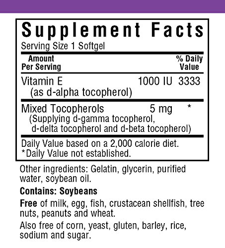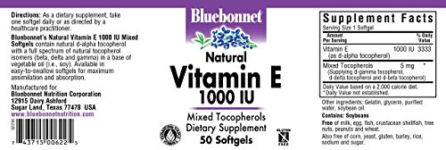 Bluebonnet's natural vitamin e mixed soft gels provide the popular, natural d-alpha tocopherol with a full spectrum of natural tocopherol isomers (beta, delta and gamma) in a base of vegetable oil (i.e., soy). Available in easy-to-swallow soft gels for maximum assimilation and absorption. Vitamin e is a powerful, fat-soluble antioxidant that helps protect cell membranes against damage caused by free radicals and prevents the oxidation of ldl cholesterol. It is necessary for the structural and functional maintenance of skeletal, cardiac, and smooth muscle. It also assists in the formation of red blood cells and helps to maintain stores of vitamins a and k.Feature