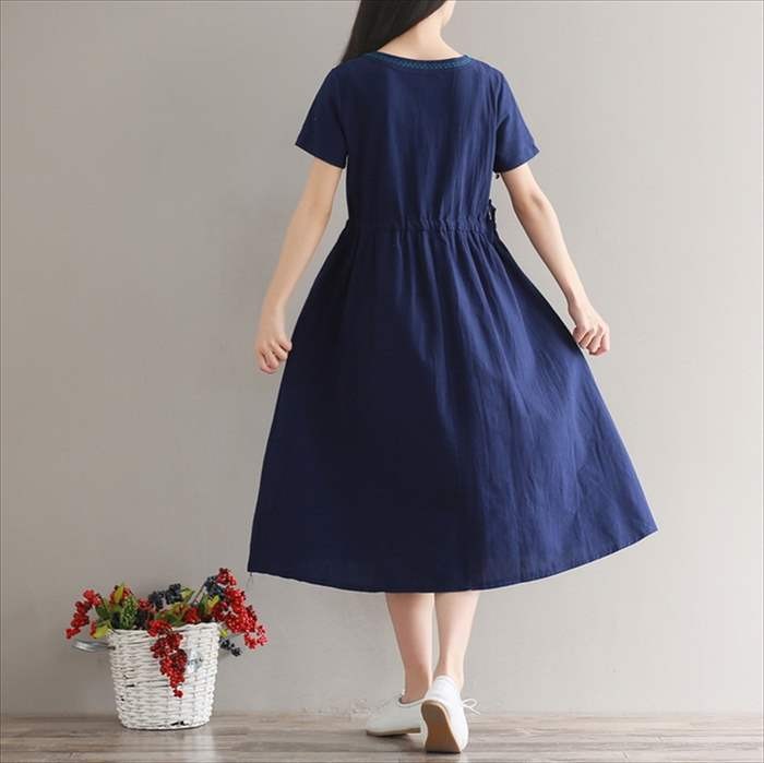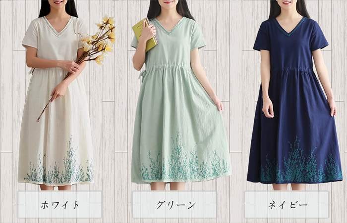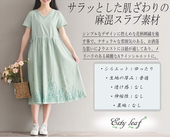 ・裾にリーフ柄の刺繍を施した、ゆったりVネックワンピース。・首回りにも刺繍と同色のステッチを施してあり、さり気ないアクセントに。・シンプルなデザインに控えめな花柄刺繍を施す事で、ナチュラルな雰囲気を演出。・ウエストには紐が通してあり、サイドから絞ればウエストラインを強調したメリハリのある綺麗なAラインシルエットに。・素材はサラっとした麻混のスラブ素材を使用しており、着心地は抜群♪・全体的にゆったりとしたAラインシルエットになっており、体型カバーもバッチリ♪ ●サイズ展開 【M】着丈106cm バスト92cm 肩幅38cm 袖丈18cm【L】 着丈107cm バスト96cm 肩幅39cm 袖丈19cm※平均での採寸となりますので、多少の誤差が生じる場合がございます。ご了承くださいませ。●カラー展開 ホワイト グリーン ネイビー●商品詳細 【素材】:コットン・リネン 【透け感】:なし 【厚み】:普通【裏地】:なし 【シルエット】:ゆったり 【伸縮性】:なし【付属品】:なし (コーディネート使用の衣類、アクセサリー等は付属しません)20代 30代 40代 50代 人気 レディースファッション 大きいサイズ