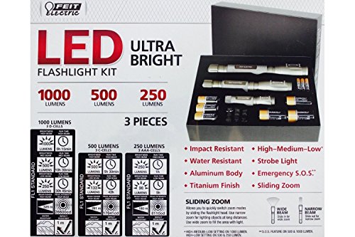 FEIT Electric LED Silver Flashlight Kit | 1000, 500, 250 Lumens | Slide Zoom | Duracell Batteries Included | Titanium Finish
