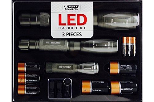 - Kit includes 3 flashlights (1000, 500 and 250 Lumens), 3 AAA batteries, 3 C batteries, 3 D batteries and 3 wrist straps