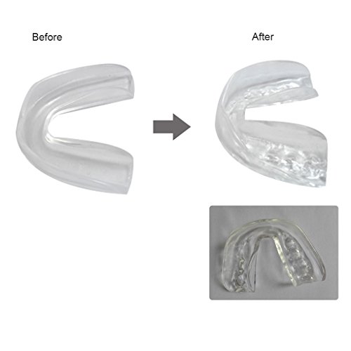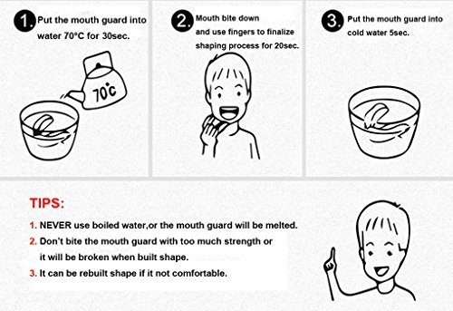 Moldable material for protecting your teeth better --- Put the mouth guard into water 70degrees Celsius for 30sec;Mouth bite down and use fingers to finalize shaping process for 20sec;Put the mouth guard into cold water 5sec;finished!