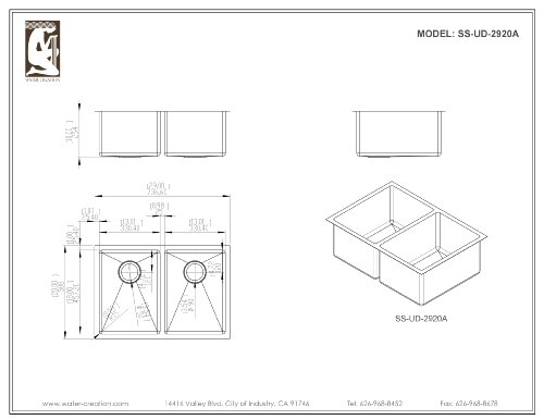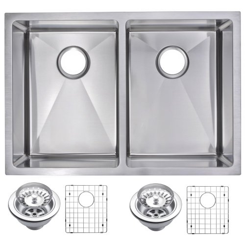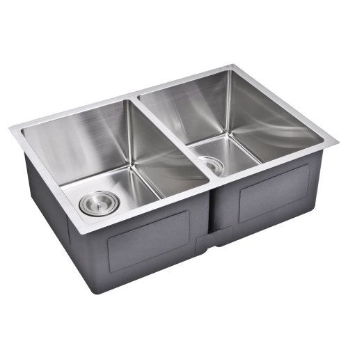 Water Creation SSSG-UD-2920A 29" X 20" 15 mm Corner Radius 50/50 Double Bowl Stainless Steel Undermount Kitchen Sink with Drain and Strainer