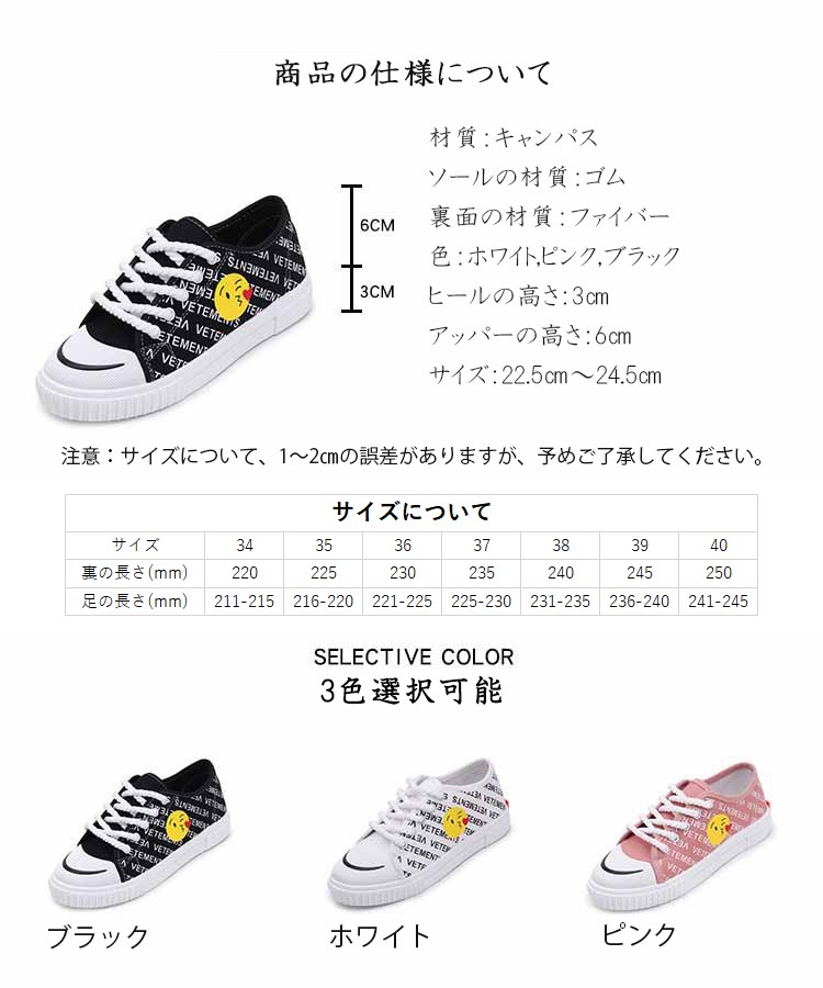 材質:キャンパス ソールの材質:ゴム 裏面の材質:ファイバーヒールの高さ:3cm アッパーの高さ:6cm サイズ:22.5cm~24.5cmEU36=22.5cm EU36=23cm EU37=23.5cm EU38=24cm EU39=24.5cm EU40=25cm 注意:※ サイズなど、商品詳細を必ずご確認後、ご了承頂いた上でご購入をお願いします。また、採寸方法違いにより、0.5~1cmの誤差がございますので、ご了承ください。特徴:【軽量、通気性よい】ゴムのソールとキャンパスの材質でスポーツシューズならではの軽さを実現し、通気性もよいです。どんな季節でも着用します。 軽量なので、ランニングや歩くや他の運動が易くになりました。【ファッションな配色】ファッションな配色で、シューズがファッションになり、女性に最適です。中学生などに通学靴としてもよい選択です。 【ゴムのソール耐滑】柔らかい材質で作って、ゴムのソールので、耐滑のです。スムーズな足運びをサポートします。球技や他の運動にもスムーズになりました。【利用場合】スポーツだけでなく、通勤や通学やアウトドア、普段履きとしても カジュアルなコーディネートをお楽しみい ただけます。