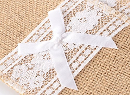 10 Pack of 4" x 8" Natural Hessian Burlap Silverware Holders with White Lace & Ribbon Bow for Wedding Reception Table or Rustic Decoration for a Bridal Party or Baby Shower by Jolly Jon