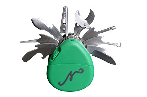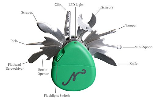 The Tools: Knife, Scissors, Roach Clip, Tamper, Mini-spoon, Bowl Scraper, Bottle Opener, Flathead Screwdriver, Pick/Poker, LED Flashlight (w/ batteries included).