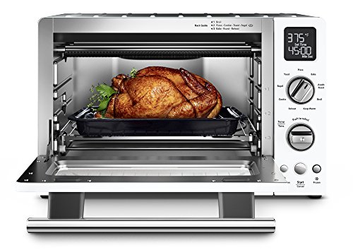 - Feature : Even-heat technology provides consistent heat throughout baking cycle for delicious results. / Use your countertop oven to bake pizza, broil a side dish, keep an already cooked dish warm or toast bread. / 9 pre-programmed functions such as the Asado Roast Function to precisely adjust from high sear to optimal cooking temperature for superior roasting. / 120-minute timer can be set to remind you when a dish is finished and offers plenty of time for the requirements of most recipes / Offers enough room to cook 2-12" pizzas, or cornish hens. The oven cavity also features a non-stick coating for easy cleaning. / Includes 12" non-stick multipurpose pan, 12" broiling rack, cooling rack, non-stick drip tray.