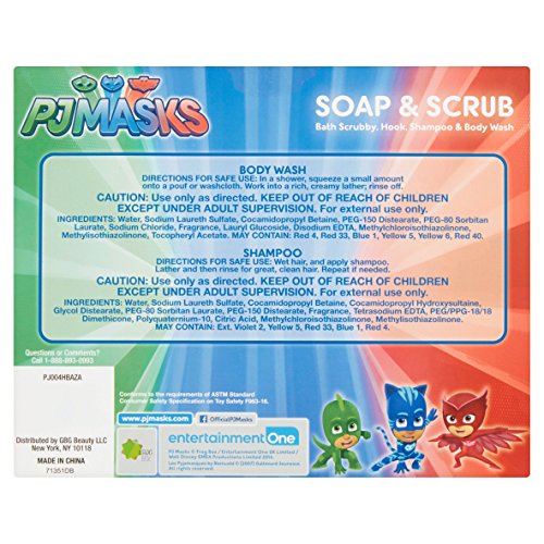 Add some fun to bath time with your children's favorite characters in this PJ Masks Kids Bath Gift Set. It includes body wash and shampoo, so kids can get all the way clean. This kids gift set is designed to be used by children over 3 years old. It has a bath hook for the scrubby that will even stick to tile, so it can be conveniently stored within easy reach. The set features vibrant colors and graphics of characters from the popular show, PJ Masks. PJ Masks Kids Bath Gift Set: Includes shampoo and body wash Bath hook sticks to tile Kids bath accessories scrub squirts water Made for children ages 3 years and up