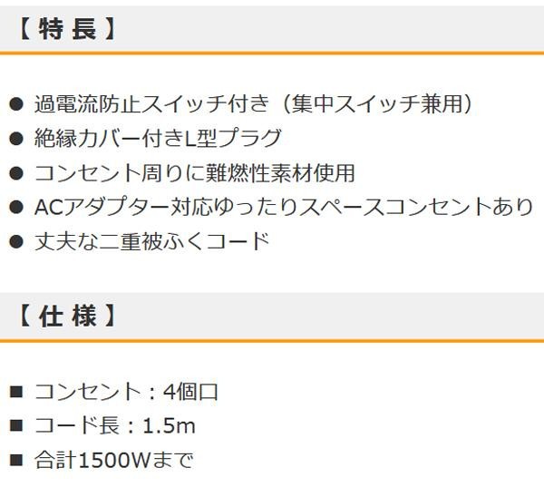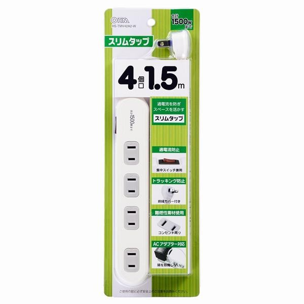 コンセント周りに難燃性素材を使用しています。丈夫な二重被ふくコードです。 生産国:中国 ※サプライヤー直送品 ご注文後3~4営業日後の出荷となります【商品名】OHM ブレーカースイッチ付 スリムタップ 4個口 1.5m HS-TMV42A2-W