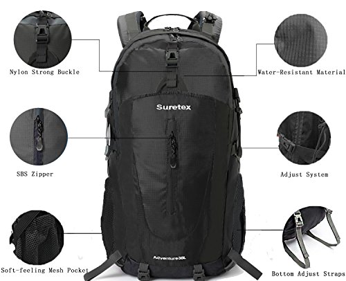 -. Brand : SURETEX -. Department : unisex-adult -. Feature : Adjustable straps- Be convenient for you to pack or hanging tent, sleeping pad,trekking pole, mat, hammock and other supplies. / Pockets-Pocket rich design provide enough room no matter if it's a day trip or a week long journey. One separators in the main compartment are convenient enough to help. / Waterproof-High quality water resistant material,waterproof zipper and extra rain cover protect contents stray dry from heavy rain, / Back support- 2 density environmently friendly foam area on the back promoting air circulation along your back and shoulder ,cool for long time carrying. / Guarantee- Offer 3 month limited warranty for the hiking backpack repair on free of charge. -. IsAutographed : 0 -. IsMemorabilia : 0 -. Label : Xiamen Yinggutou Sports Co.Ltd -. LegalDisclaimer : For improper handling, accident, exposure to extreme temperature, chemical solvent, washing without washing instructions or due to the transport of damage and normal wear, can not give guarantees. -. Manufacturer : Xiamen Yinggutou Sports Co.Ltd -. MPN : SU0099 -. PackageQuantity : 1 -. PartNumber : SU0099 -. ProductGroup : Sports -. ProductTypeName : OUTDOOR_RECREATION_PRODUCT -. Publisher : Xiamen Yinggutou Sports Co.Ltd -. Studio : Xiamen Yinggutou Sports Co.Ltd -. Title : Suretex Hiking Backpack 35 Liter Camping Shoulder Daypack With Rain Cover Unisex