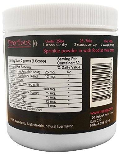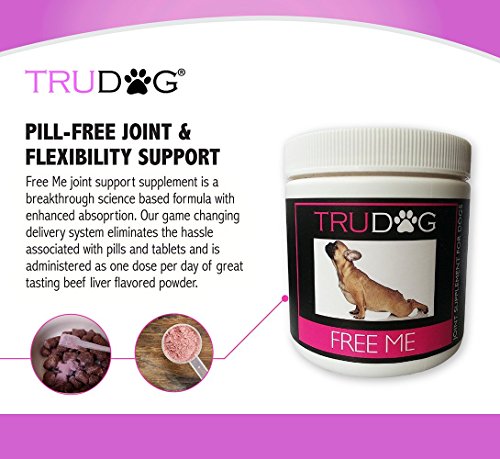 -. Binding : Misc. -. Brand : TruDog -. EAN : 0852990005042 -. Feature : The nine active ingredients helps provide essential joint nutrients and naturally feeds collagen; Material Powder / Reduces inflammation / Increases range of motion and joint cushioning / All natural liver is added to be sure your dog doesn't turn up his nose / Unlike most other joint supplements which are not easy to give, simply sP.R.Inkle the recommended dose on your dogs food daily and stop the fight to hide pills! -. Label : TruDog -. Manufacturer : TruDog -. MPN : TD5042 -. PackageQuantity : 1 -. PartNumber : TD5042 -. ProductGroup : Pet Products -. ProductTypeName : PET_SUPPLIES -. Publisher : TruDog -. Studio : TruDog -. Title : Joint & Flexibility Support for Dogs - Free Me: Advanced Joint Care Supplement (60g) - All Natural Ingredients Reduce Inflammation and Discomfort - Increases Joint Cushioning with Enhanced Absorption -. UPC : 852990005042