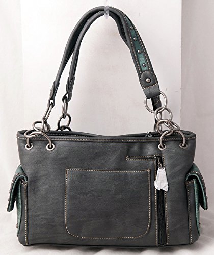 -. Feature : Size:13" x 4.5" x 8" (Drop 11") / Made of the Vegan leather (distressed color), this western satchel bag has:Scallop trimmed on the flap with magnetic closure,Accented with patina gold concho outlined with faux leather cut-out,Layered with gold, silver, patina studs and cut out pattern,A zipper enclosure for the entire purse,Inside single compartment divided by a medium zippered pocket, / Inside of bag include a zippered pocket and 2 open pockets,A zippered pocket on the back to conceal the handgun (9.5 x 6.5),A pocket on each side that snap close,An open pocket on the back,Metal feet on the bottom for protection and stability,Double flat strap/chain handle,13" x 4.5" x 8" (Drop 11"), / The Montana West Collection combines the best of traditional western elements with modern design. Montana West's handbags are an integral part of the modern cowgirl's outfit. It is an expression of individualism, strength, and trailblazing nature. Montana West is more than a handbag, it's an attitude.