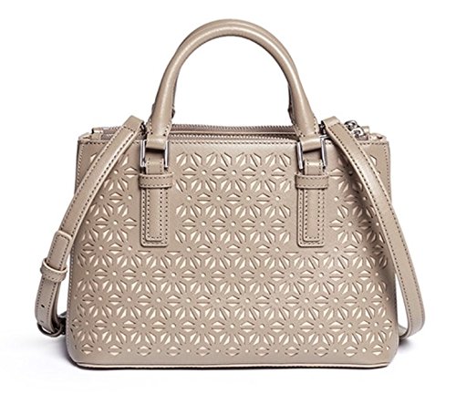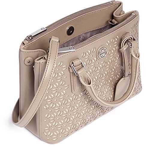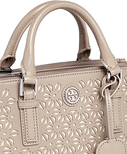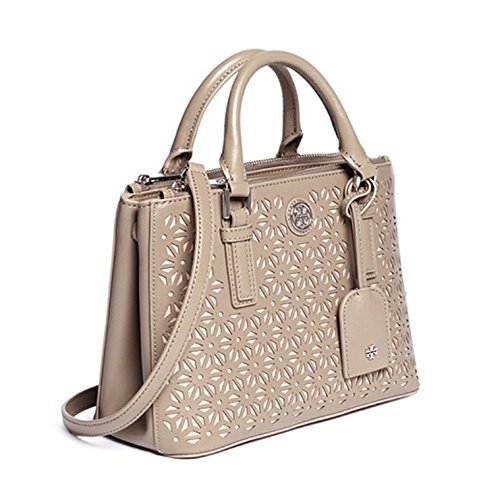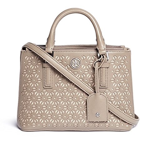 -. Brand : Tory Burch -. Color : French grey -. Department : womens -. EAN : 0888736546517 -. ProductGroup : Shoes -. ProductTypeName : HANDBAG -. Title : Tory Burch Robinson Micro Floral Laser Tote French Grey $475.00 -. UPC : 888736546517 Tory Burch floral perforated saffiano leather tote. Tote handles with square rings. Removable, adjustable strap; 23" drop. Snap-button sides; hanging ID tag. Signature double-"T" medallion at top. Front and back zip compartments. Snap top closure. Logo jacquard lining. Inside: zip and open pockets. 8.7"H x 12.6"W x 4.9"D. Bag weight: 3.6lbs. "Robinson" is imported. About Tory Burch: Tory Burch is a luxury lifestyle brand defined by classic American sportswear with an eclectic sensibility. It embodies the personal style and spirit of its CEO and designer, Tory Burch, who creates stylish and wearable clothing and accessories for women of all ages. .Height: 7" / 17.5cm Length: 11" / 26.5cm Depth: 4" / 10cm Strap drop: 19.75in / 50cm Handle drop: 3.25in / 8cm