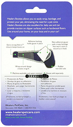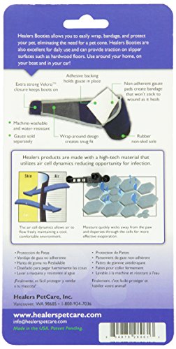Studio : Healers PetCare, Inc Publisher : Healers PetCare, Inc Binding : Misc. Product Description Healers Booties are designed for protection and healing. The Healers boot provides air flow and moisture wicking properties, decreasing the opportunity for infections and shortening recovery time for injuries to the animal. Healers are manufactured with a High Tech medical grade material that is used in the human market for healing wraps. Its outer surface is loop fabric so the hook can attach anywhere. This provides pet owners the ability to get a snug, secure, fit as they wrap the boot around the paw. The Velcro Hook applied is low profile, high tensile strength hook that enables a strong hold, keeping the boot in its place. Healer's uses the highest quality components available and are made in the USA. They are recommended and used by Veterinarians. Our boots are made to last and are machine washable. Healers Gauze Inserts are designed to fit right inside the boot turning the boot into a non-adhesive bandage. The gauze pads will not stick to the wound while it heals and it has adhesive on the back side so you can place it where you need it. Healers Boots are comfortable, they provide traction on hardwood floors and the synthetic leather sole are perfect for light outdoor use. Best of all they are a bandage that is easy to use and make dressing changes a snap. Healers booties are sold as individual units or in a box set with 2 boots and 2 gauze inserts. They come in 5 sizes from extra small to extra large. Healers Gauze pads can be purchased separately. If you need added protection, check out Healers Leg Wraps. The leg wraps will connect to the boots extending the boot up the leg. 0