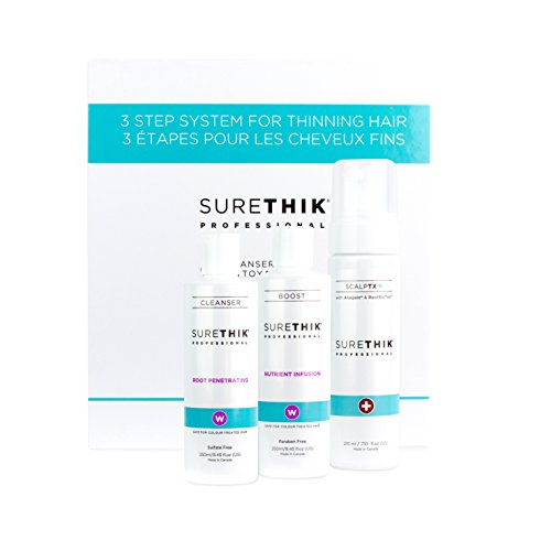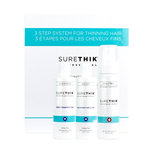 This 3 Step Hair Thickening System is uniquely formulated to effectively target Men's and Women's Hair loss using AnaGain® and RootBioTec® plus a proprietary blend of nutrients and botanical ingredients. ScalpTX + energizes the scalp to produce stronger, fuller and thicker looking hair. STEP 1: Root Penetrating Cleanser Our shampoo is sulphate free, paraben free and is designed specifically to remove build-up of sebum & cleanse the scalp to eliminate harmful toxins and pollutants. The shampoo also deposits nutrients and extracts to help nourish thinning, weak and damaged hair. Infused with Aloe, Panthenol, Fruit and Seed extracts, SureThik® Shampoo promotes healthy hair growth and prepares the scalp for Step 2 and 3 of our hair thickening system. STEP 2: Nutrient Infusion Conditioner This light weight formula contains premium, nutrient rich ingredients to moisturize, nourish & strengthen your hair. Infused with Aloe, Argan - Moringa - Jojoba - Sweet Almond oils, along with Panthenol, Zinc, Nettle and a variety of Natural extracts that will strengthen, add volume and shine, and make the hair feel smooth and luxurious without weighing the hair down. STEP 3: ScalpTX+ Strengthen, thicken and revitalize the appearance of weak and thinning hair. Using clinically proven ingredients AnaGain® & RootBioTec® plus our proprietary blend of ingredients, ScalpTX + is designed to strengthen and revitalize your thin, weak and fine hair. Furthermore, it improves the look of your hair density and fullness without the use of harmful drugs or chemicals. Expect to see stronger, longer, fuller looking hair from root to tip.Feature