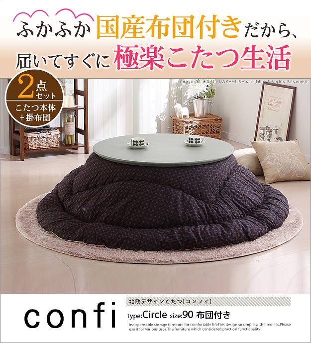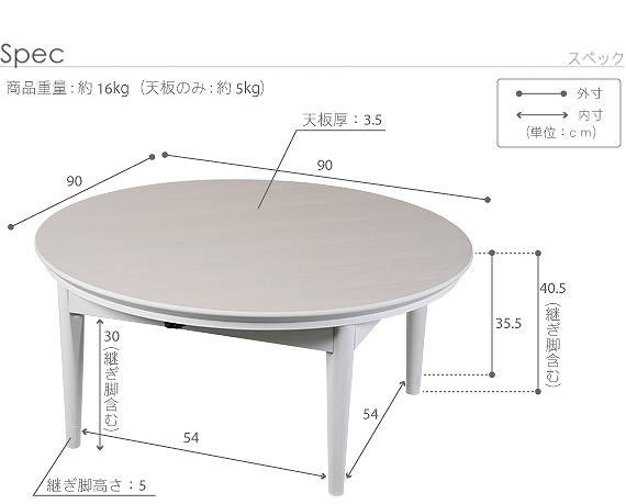 サイズ(cm):こたつ-90x90x34.5(丸型)・16kg、布団-幅205x奥行205・約1.8kg