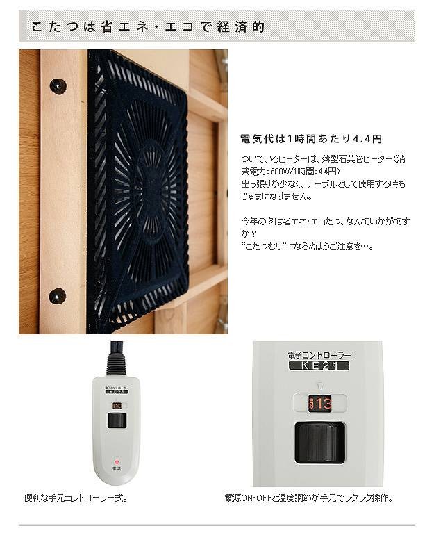 商品について:木目が美しい素朴な風合いが魅力の日本製こたつと色柄豊富なこたつ布団のセットです。シーズンオフにはリビングテーブルとして。こたつ布団はクッションやカバーにも使われる丈夫な国産生地を使用し、国内工場で綿入れ・縫製をしました。ボリュームたっぷり!すみまでしっかり綿が入ったふっかふかのこたつ布団です。薄型石英管ヒーター(600w)。便利な継ぎ脚付(5cm)。