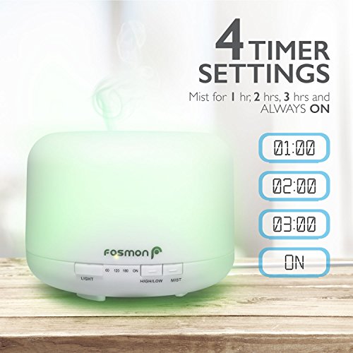 - [MULTIPLE RUN TIMES WITH HIGH AND LOW MIST OPTIONS] Fosmon’s diffuser includes a selection of run times to suit your needs. Choose one, two, or three hours, with an option to select between high and low mist. It also features a constant ON option and will power off automatically when water runs out.