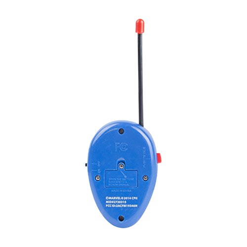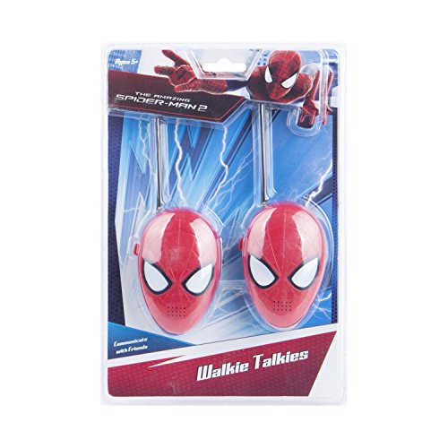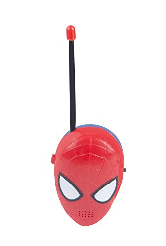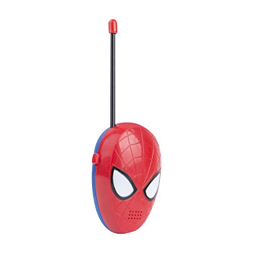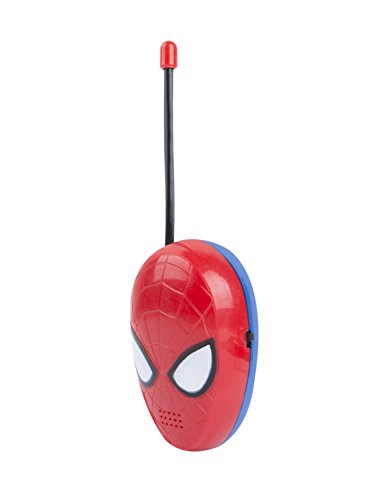 Talk to your friends indoors or out with these great Spider-Man Walkie Talkies. The Spider-Man Walkie-Talkies feature a flexible safety antenna, simple push-to-talk operation, and a built-in speaker that assures fun for all ages. They are perfect for your next adventure: easy to use and featuring your friendly neighborhood Spider-Man. Includes two walkie talkies with a wireless range of 1,000 feet. Sleek Spider-Man style on easy-to-use walkie talkies. Use the two Spider-Man walkie talkies to communicate with your friends across the yard, or across the house. This walkie talkie set is great for outings to the local park, playing in the yard, camping, or anywhere you want to keep in touch while playing. The listening range of up to 1,000 feet makes it great for outdoor play. The simple push-to-talk operation of the Spider-Man Walkie Talkies makes it fun for kids 3 years and up. The Spider-Man Walkie Talkie Set has a strong wireless range, but is easy to use for kids. A simple blue talk button is highly visible and easy to find by touch, and activates the built-in microphone. Its small size makes it convenient to carry around, even for smaller hands. A black on/off switch on the other side of the walkie talkie makes it easy to turn on and off. This set requires one 9V battery per walkie talkie (not included) and is intended for ages 3 and up. These two-piece Spider-Man Walkie-Talkies are a perfect accessory for your next adventure. The walkie-talkie units are shaped like the head of Spider-Man, with eyes that light up during operation. With easy-to-reach controls and a flexible antenna with a capped top for safety, these walkie-talkies offer simple and imaginative play for kids and parents, indoors or out, thanks to incredibly easy operation and a Morse code option.Feature