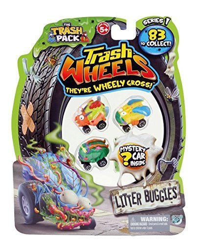 -. Feature : Trash Pack Wheels LITTER BIES Blister (4-Pack) / Rubbish just got revved-up with the new Trash Pack Trash Wheels collection! A brand new Trash Packs range, have a 'wheely' gross time racing these Trash Wheels vehicles around the garbage yard! There are over 83 cars to collect in the form of 6 gruesome teams: the Muck Trucks, Litter Bies, Skid Marks, Army Junk, Take Aways and Rust Busters! One supplied, colour and style may vary. Suitable for ages 5 and above. / Safety Information: Warning. Not suitable for Children under 3 years.