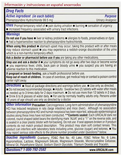 ReleaseDate : 2016-01-02 Studio : Alva-Amco Pharmacal Cos., Inc Publisher : Alva-Amco Pharmacal Cos., Inc Binding : Health and Beauty Product Description Uricalm?Maximum Strength Tablets provide the maximum non-prescription strength of clinically proven Phenazopyridine HCI to relieve pain, burning, increased frequency, and sensation of urgency associated with urinary tract infections.?Uricalm Max?has 99.5 mg of Phenazopyridine HCI ? no other OTC brand contains more of this highly effective medicine that works right at the source of UTI pain. Plus, Uricalm Max?contains cranberry, which is used extensively by those concerned about urinary tract health. 0