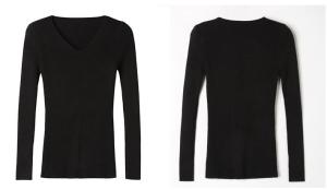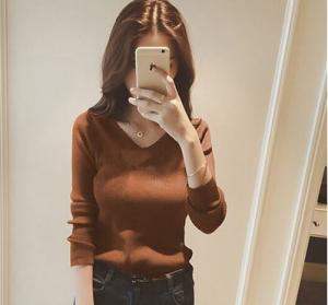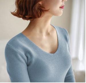 丸みを帯びたVネックラインが、女性らしい優しい印象をかもしだしていますね。
