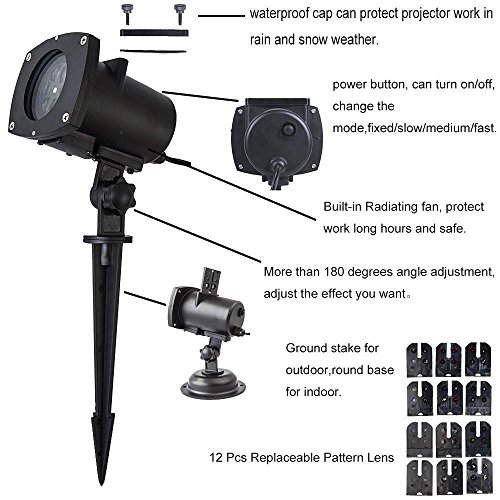 -. Feature : [PROMOTION] GET 10% OFF TODAY! - Just add our Projector Light to your shopping cart and enter code 9JRAOU6Z / [OCCASION]: Consumers can insert different Slides into the card slot according to the festivals, mood and patterns, convenient operation. the best projection area range is 5*5 square. It also can be projected on the surface of the water, magnificent. / [12 KINDS OF PATTERN]: The projector lights has 12 kinds of patterns (Christmas, Halloween, birthday party, doves, sP.R.Ing series, autumn series, Queen's day classic, snow, Star series, love series, Carnival series, butterfly series). / [EFFICIENCY]: The Gobos Garden Lamp has built-in temperature start system with the fan cooling, can avoid low temperature difficult to start and high temperature burning machine. So the xmas lights can be used in -40~80 degrees. / [DESIGN AND GREE]:This holiday lights has 5 meters long UL power line, with large TDC exemption power supply, it is more stable quality, high safety performance. The Landscape Christmas Light use Imported ABS resin material has strong resistant, non-toxic, good power performance. No leakage risk.