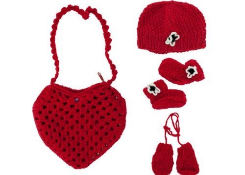 -. Title : Red Heart-Shaped Bag with Beanie, Mittens and Booties - 6 Piece Set