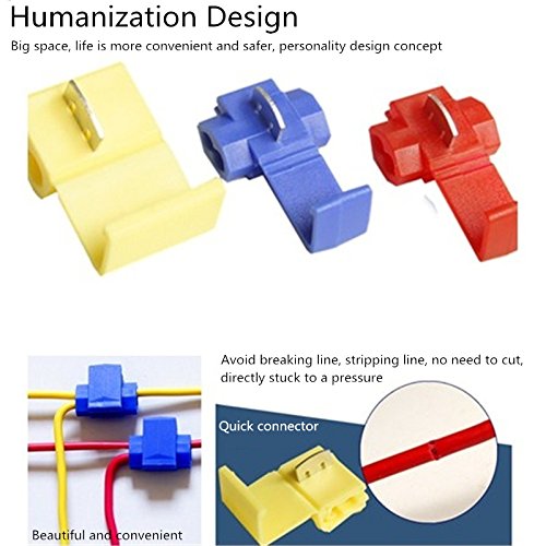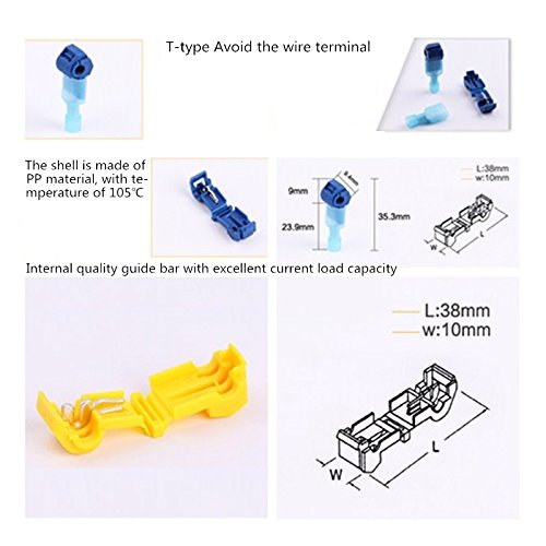 Red A.W.G: 22-18 X 15pcs Wire range: 0.5-1.0mm² Male spade Connectors X 15pcs Blue A.W.G: 18-14 X 15pcs Wire range: 0.75-2.5mm² Male spade Connectors X 15pcs Yellow A.W.G: 12-10 X 15pcs Wire range: 4-6mm² Male spade Connectors X 15pcs Quick splice terminals Connector