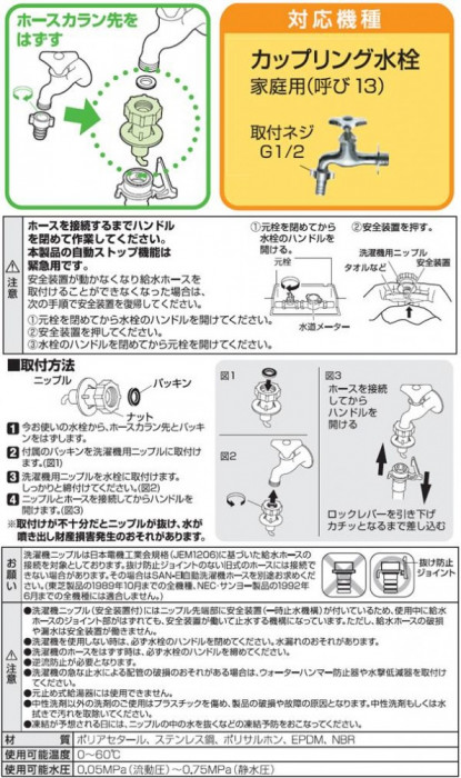 洗濯機用ニップルを混合栓に使用される場合には、逆流防止のため、逆流防止弁付の器具あるいは、湯または水のみでご使用ください。
