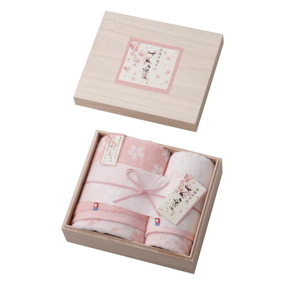 | タオル産地として有名な愛媛県今治の職人が桜の花びらから抽出した染料で糸を染め、その美しい桜色の糸を心を込めて織り上げた逸品です。色だけではなく、今治タオル産地が誇るジャカード織で桜の柄を織り上げています。木箱にお入れした上品且つ高級感漂うセットは結婚の引き出物や出産祝い、内祝いなどでお喜び頂いております。 |