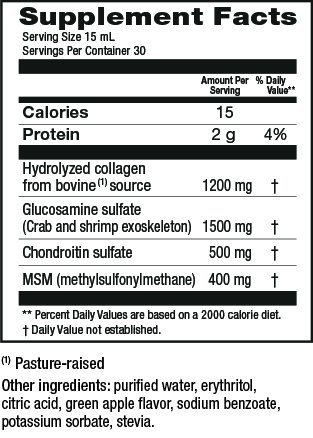 MAXIMUM BENEFITS; SMALLER DOSE: Our liquid joint supplement for adults gets to work much faster thanks to the extra-fast absorbing AminoLock collagen that has the lowest molecular size peptides in the world. 1/2 ounce daily serving of the optimized 4-in-1 formula is the equivalent of taking 8 combined capsules of collagen, glucosamine, MSM, and chondroitin.