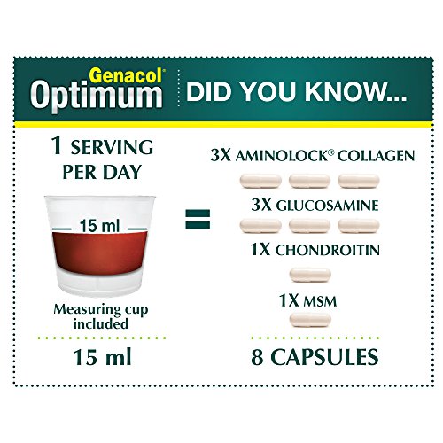 GENACOL OPTIMUM - THE MOST COMPLETE JOINT FORMULA AVAILABLE! AminoLock Collagen, Glucosamine, Chondroitin, and MSM are essential ingredients to maintain joint health. Impressive joint health results are achieved because of the combination of the 4 natural active ingredients. The liquid form of Genacol Optimum facilitates its absorption by the body, helps fight "pill fatigue", and is ideal for people who wish to live an active lifestyle while maintaining and preserving optimal joint health. Genacol Optimum supports healthier and stronger ligaments and tendons and promotes healthy joints and connective tissues. 4 ACTIONS RELIEF : AminoLock Collagen : Helps to maintain healthy joints Glucosamine - Chondroitin - MSM : Protect and lubricates joints