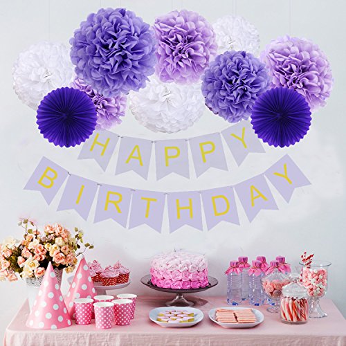 Studio : JUSLIN USA Publisher : JUSLIN USA Binding : Office Product Product Description Package Includes: 3 × 8" paper lantern (dark purple, light purple, white) 3 × 10" paper lantern (dark purple, light purple, white) 3 × 8" paper pom pom (dark purple, light purple, white) 6 × 10" paper pom pom (dark purple, light purple, white) 2 × 8" purple paper fan 10 × 10" purple balloon 1 × 11.5ft purple happy birthday banner