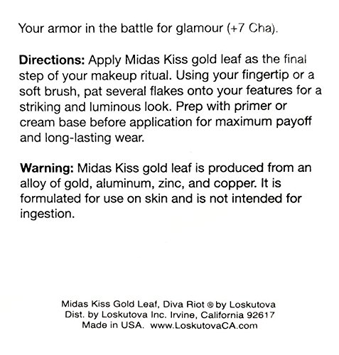 -. Feature : SPARKLE AND SHINE: Midas Kiss is a golden pulse of pure decadence that delivers instant glamour. / STYLE: Whether used sparingly or throughout the face for maximum drama, Midas Kiss imparts wearers with an opulent, radiant glow. Add gold leaf to the corners of a smoky eye to create mesmerizing contrast, or dust a delicate amount onto your cheekbones for subtle, radiant glimmer. Indulge yourself with an exquisite scattering of brightest sunlight. / HOW TO WEAR: Apply Midas Kiss Gold Leaf as the final step of your makeup ritual. Using your fingertip or a soft brush, gently pat several flakes onto your features for a striking and luminous look. For maximum payoff and long-lasting wear, dab on a bit of P.R.Imer or cream base before application. / ABOUT: Midas Kiss has an airy texture that ensures total skin comfort. This cosmetic is vegan and free from both parabens and sulfates. Diva Riot products are always cruelty free. Made with care in the USA. / CONTENTS: Each jar contains 0.004 oz of loose gold leaf flakes produced from an alloy of copper, zinc, aluminum, and gold. It is formulated for use on skin and is not intended for ingestion.