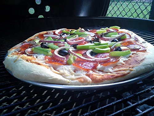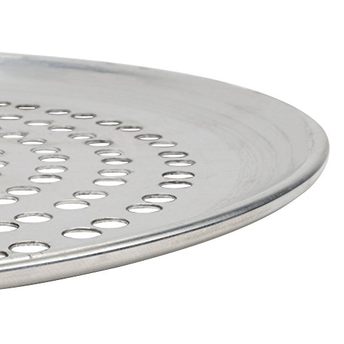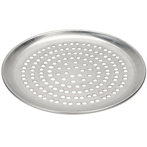Grill your favorite pizzas on this 12" perforated pizza pan! This pan has over 100 3/8" holes that provide a golden crispy crust, and allow the proper amount of smoke penetration. Each pan is made from 18 gauge, 1 mm thick standard weight aluminum with a wide, flat bottom that heats quickly and evenly. For best results, season with a light coating of vegetable oil before use. Simply wet a paper towel with small amount of oil and rub it in to the surface of the pan. Dishwasher safeFeature
