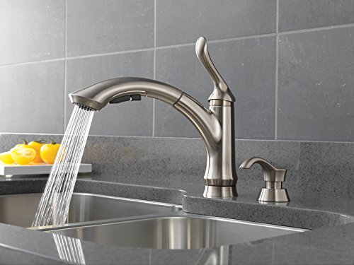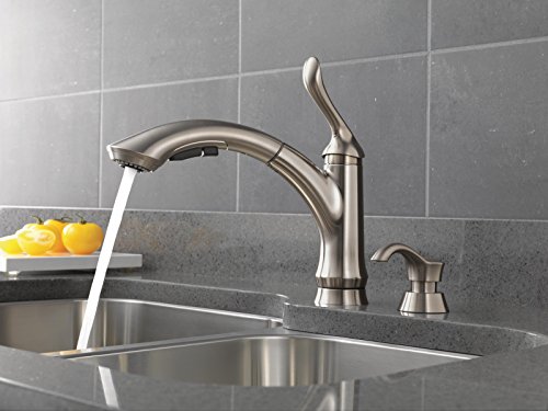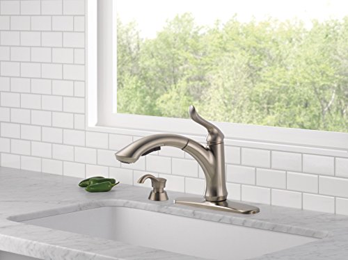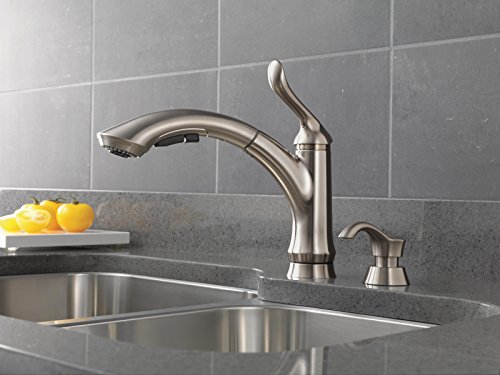 Delta 4353-SSSD-DST Linden Single Handle Pull-Out Kitchen Faucet with Soap Dispenser, Stainless
