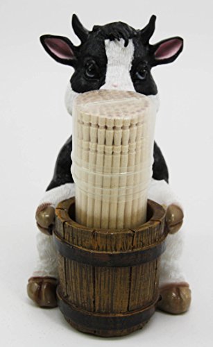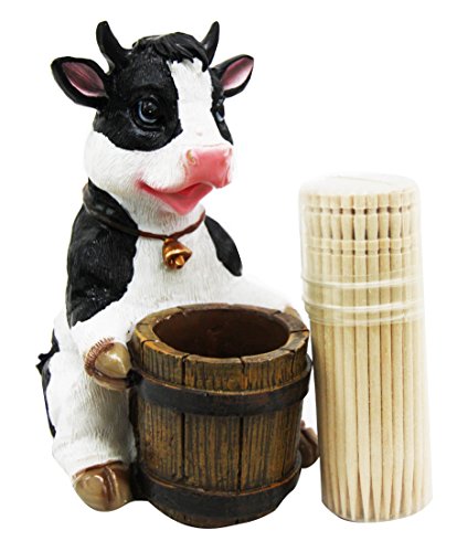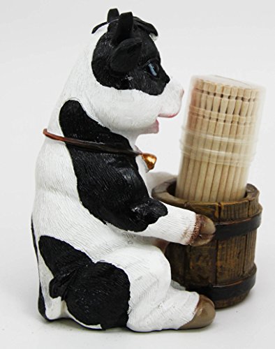 Get rid of that boring plastic toothpick container at your home and replace it with this pretty cow toothpick holder figurine! This farm cow with bell collar is hugging a wooden barrel that would perhaps usually contain jugs of cow milk. Beautiful craftsmanship and detail highlights this excellent figurine brought to you at a very affordable price!