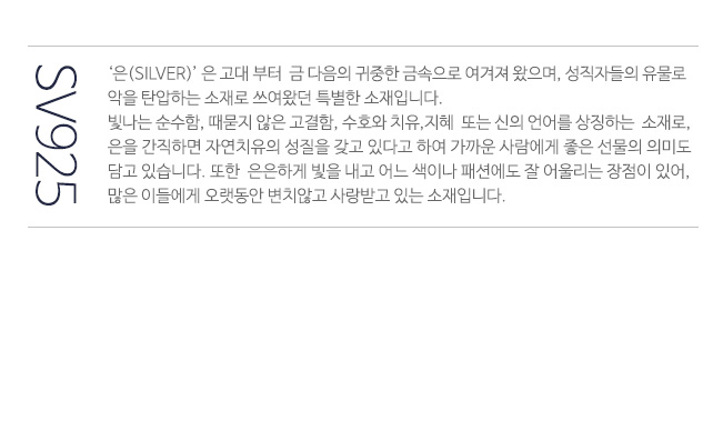 원석 이외에는 92.5% 실버 소재로 구성되었으며, 네추럴한 원석 특유의 컬러와 질감이 유니크하고 고급스러운 제품입니다.