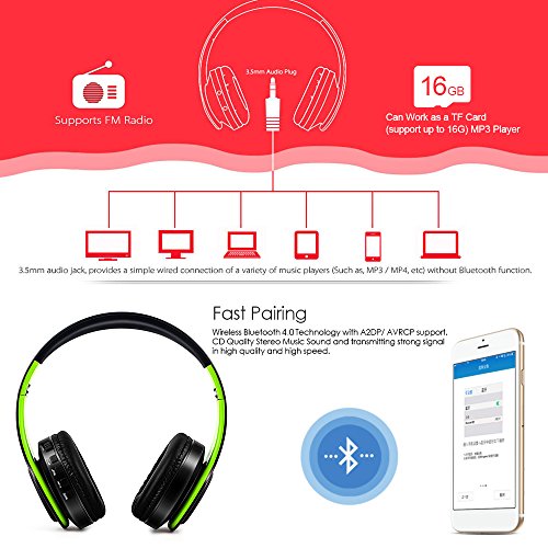 -. Binding : Electronics -. Brand : Docooler -. Feature : [Multifunctional Design] 4 in 1 Multifunctional: Adopting Bluetooth 4.0 Wireless Technology(Easy to pair with almost any Bluetooth-enabled audio players devices), equipped with 3.5mm audio jack(provides a simple wired connection of a variety of music players, such as, MP3 / MP4, etc. without Bluetooth function devices), comes with built-in FM Radio Module (bring you much convenience to listen to news).Also can work as a TF Card (support up to 16G) MP3 Player. / [Advanced Bluetooth Technology] Latest Wireless Bluetooth 4.0 Technology with A2DP/ AVRCP support, ensure transmitting strong signal in high quality & high speed and offering high-fidelity stereo music, filling your world with premium sound: from richest bass to a pure, balanced response for natural sound. / [Ergonomic Design] Light and Portable, folding and adjustable headband length design. Its ear cushion design is based on the outline of human ear which is comfortable to wear and can greatly insulate the noise around you, so you can hear your music and call clearly. The Over-ear styling is stable, guarantying 100% Stable and Comfortable when walking, exercising, running, climbing, skating, cycling, fishing and other outdoor activities. / [CVC6.0 Noise Cancellation & High-sensitivity Mic] Adopt Built-in CVC6.0 Noise Canceling Technology and high-sensitivity microphone to reduces ambient noises and grasp the detail of voice, enabling clearer sound from microphone. You can get high quality hands-free phone conversation even on the street or inside a shopping mall. / [Long Standby Time & Fully Compatibility] Built-in rechargeable Lithium battery lasts up to 10 hours of Talking Time / 8 hours of Music Playing Time (Almost Daylong Time) and 250 hours of Standby Time per charge cycle. And universally compatible with most Bluetooth-enabled devices, including iOS / Android / Windows Smart phones & Tablet PC and other Bluetooth devices. -. Label : Docooler -. Manufacturer : Docooler -. PackageQuantity : 1 -. ProductGroup : CE -. ProductTypeName : CONSUMER_ELECTRONICS -. Publisher : Docooler -. Studio : Docooler -. Title : Docooler Wireless Bluetooth 4.0 Headphones MP3 Player TF Card FM Radio 3.5mm Wired Earphone Hands-free w/ Mic