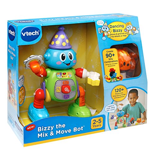 Play pretend with Bizzy the Mix and Move Bot by VTech by mixing and matching his 10 interactive accessories. Place the pirate hat on Bizzy’s head and he’ll pretend to search for treasure. Add the baseball glove to his arm and Bizzy will imagine he’s the best pirate baseball player ever! Bizzy's 10 accessories combine in more than 90 different ways, triggering lights and silly responses. Put on Bizzy’s legs and press the gears button to see him do a robot dance to the music. Bizzy will also challenge your little learner by asking them to attach different accessories on him. Create a robot symphony by attaching his accessories for a variety of interesting sound effects. With Bizzy around, the fun never stops! Requires 3 AA batteries (batteries included for demo purposes only; new batteries recommended for regular use). Intended for ages 2 to 5 years.Feature