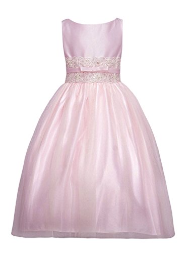 Charming . . . New Vintage Inspired Metallic Lace and Tulle Flower Girl Dress; Sleeveless Matte Satin Bodice; Wide Metallic Lace Waistband with Contrasting Satin Ribbon Sash & Bow; Multi-Layered Illusion Tulle Mid Calf Length Skirt with Built in Netted Slip; Back Zippered Closure and Tie Sash for a Customized Fit at the Waist; 100% Polyester; Hand Wash Only; Made in the USAFeature