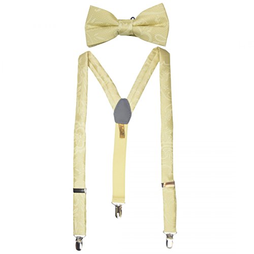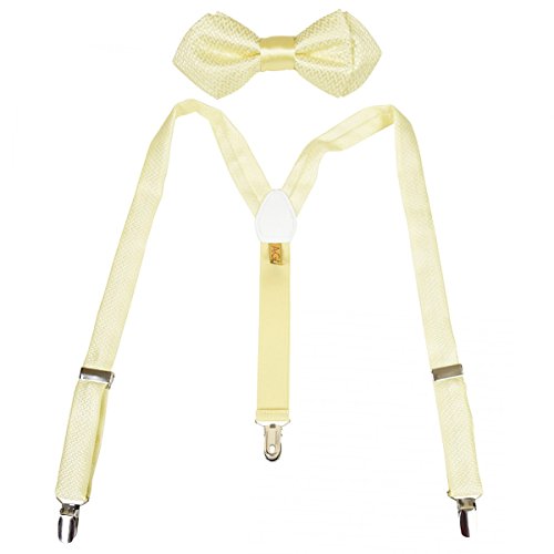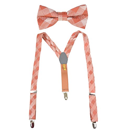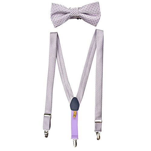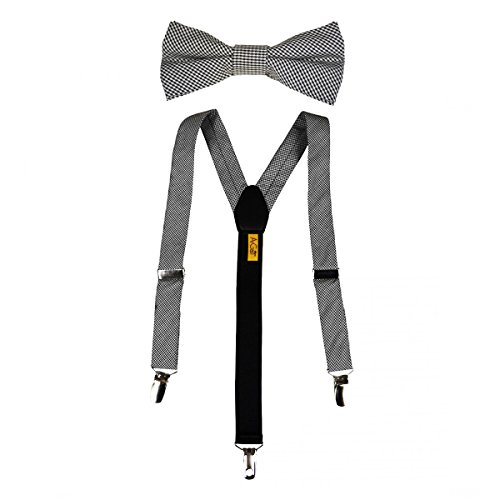 Binding : Apparel Product Description This is an adorable boys bow tie and suspender combo. The matching fabric and print in both the bow tie and suspenders makes this set perfect for special occasions. Turn your little guy into the star of the show! The bow tie measures 4 inches wide and has an adjustable band with a hook closure. The matching suspenders are fully adjustable and fits boys ages 3-9. The elastic on the back is 8 inches and the front bands can be adjusted from 10 inches to 20 inches. 0