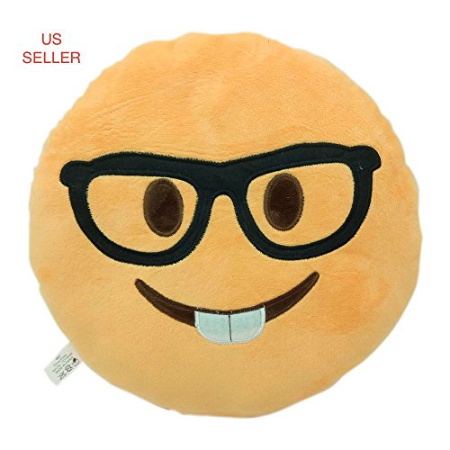 NERD NERDY Emoji Pillow Smiley Emoticon Yellow Round Cushion Stuffed Plush Soft Toy(Poop,Pinkpoop,Monkey,Money Mouth,Cat,Heart Eye,Laugh to Tear,Smirking,Throwing Kiss,Tongue,Devil,Nerd) (NERD)